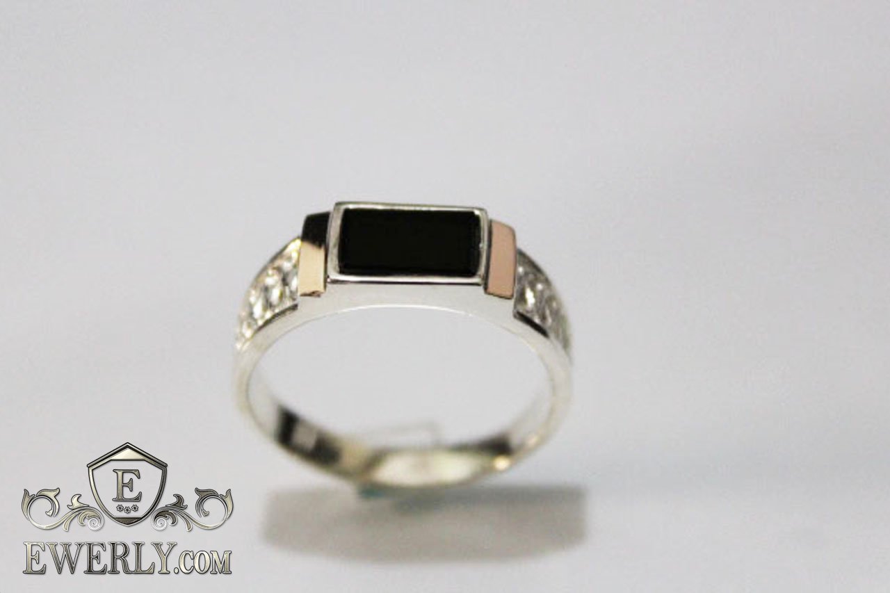 Мужской перстень из серебра 925 пробы с золотыми пластинами 375 пробы и чёрным камнем для мужчины, камень Оникс.
